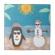 Un bonhomme de neige et un pingouin prennent des vacances à la plage.