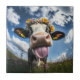 Une image ludique et rapprochée d'une vache debout dans une prairie ensoleillée, ornée d'une couronne florale vibrante faite de marguerites et de fleurs sauvages. La vache sort sa langue, ajoutant une touche d'humour et de charme à la scène. Le ciel bleu vif et les nuages doux de l'arrière - plan renforcent encore l'atmosphère joyeuse et fantaisiste de l'image.