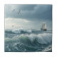 Ondes océaniques avec mouettes volant au-dessus et un navire au loin