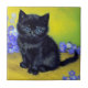 Carrelage avec un chat noir dans le style de Vincent van Gogh! Cette chatte aux yeux bleus s'assied adorablement avec des fleurs violettes contre un mur vert et une table jaune. Un cadeau merveilleux pour les amoureux de les chats et les collectionneurs d'art hollandais !