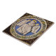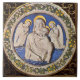 Élégant classique, art Renaissance plein de vie, chef-d'oeuvre de Bottega della Robbia ( Florence - Italie ) en blanc, bleu, vert, marron.Vierge aux anges ailés blancs dans le ciel bleu sur une couronne fleurie décorative avec une pierre Gem 3d brillante.