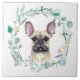 Un adorable portrait en aquarelle d'un petit Bulldog français à l'intérieur d'une couronne de feuilles vertes bleues est la caractéristique de ce carrelage décoratif et utile. Parfait pour tous ceux qui aiment un Français !