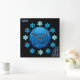 Parfait pour la maison juive, cette horloge murale présente un design original sur le noir. Au centre se trouve la peinture numérique d'une pièce ronde bleue de burlap estampillée avec une vue familière de Jérusalem ombragée pour imiter une sphère avec la légende "L'ANNÉE PROCHAINE" voûtée ci-dessus & "IN JERUSALEM" en lettres de blocs décalées en bas à droite. Les marqueurs horaires sont soutenus par des étoiles individuelles à 6 pointes. Personnalisez les initiales en haut à gauche ou en clair.