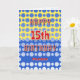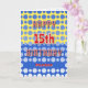 Joyeux anniversaire à un garçon ou une fille de 15 ans. Ajoutez leur nom sur le devant et personnalisez le salut à l'intérieur. L'avant a le texte en rouge et blanc vif, avec un arrière - plan de cercles bleus dégradés sur un arrière - plan de blocs bleu et jaune. À l'intérieur, l'arrière - plan est un motif similaire de cercles répétitifs. Le message personnalisable est "Il est temps de célébrer Amusez-vous et mangez du gâteau. Ce jour est spécial Et vous aussi ! JEUX ANNIVERSAIRE"