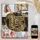 Carte de 15e anniversaire personnalisée avec 9 photos personnalisées et ballons en papier empreinte de léopard tendance en noir et or. Le modèle est prêt pour vous à télécharger 9 de vos photos préférées qui sont affichées dans un collage photo en formats carré et portrait. Vos photos entourent les ballons posters de animaux, décorés de confettis noirs et dorés. Vous pouvez également ajouter un message à l'intérieur - ou vous pouvez laisser l'intérieur vide si vous préférez écrire à la main à l'arrivée.