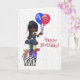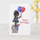 Une jolie carte pour une fille de 18 ans. La carte comporte une fille à la peau foncée et aux gros yeux assise sur des paquets tenant des ballons. Arrière - plan Confetti.