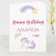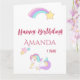 Une mignonne licorne et un arc-en-ciel aux étoiles. Arrière - plan blanc. Modèles pour le nom et l'année. Avec le texte : Joyeux anniversaire! écrit en rose foncé et avec fausse parties scintillant. Vous pouvez ajouter une couleur à l'arrière - plan pour correspondre à votre thème de fête en cliquant sur "personnaliser" et choisissez "sélecteur de couleurs" Espace pour écrire à l'intérieur à la main. Timbre correspondant disponible.
