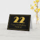 Cette conception de carte de vœux thématique d'anniversaire inspirée de l'ère des Années Folles et de l'apparence vintage présente un grand numéro « 22 » inspiré de l'apparence art déco, le message « Joyeux 22e anniversaire », un nom personnalisé et un motif de bordure composé de fines lignes sur le devant. Le fond de la face avant est de couleur noire. L'intérieur contient un message de vœux d'anniversaire modifiable, ou pourrait éventuellement être effacé et laissé vierge si un message doit être écrit à la main à la place. Une carte d'anniversaire personnalisée comme celle-ci pourrait être utilisée pour souhaiter un joyeux anniversaire à quelqu'un pour son vingt-deuxième anniversaire.