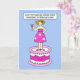 Une femme glamour debout sur un grand gâteau rose et blanc, contre un arrière - plan bleu ciel. La femme dit "Seules les personnes très spéciales ont un anniversaire le 29 février".