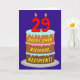 Le devant de cette carte de voeux joyeuse et amusante à thème d'anniversaire présente une représentation d'un gâteau d'anniversaire à trois niveaux avec des bougies en forme de chiffres sur le dessus montrant le numéro "29", avec le message "HAPPY 29TH BIRTHDAY", et un nom de destinataire modifiable. L'intérieur a un message de voeux d'anniversaire modifiable, ou peut-être peut-être être effacé et laissé vide si un message doit être écrit à la main à la place. Une carte de voeux d'anniversaire joyeuse et personnalisable comme celle-ci pourrait être une façon amusante d'envoyer un message d'anniversaire à quelqu'un qui célèbre son vingt-neuvième anniversaire. [~Z0000620]