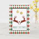 Une carte de voeux qui dit "Joyeux Noël" sur le devant et un message personnalisé sur le dos. Conçu avec une illustration de 2 cerfs de Noël sautant. Les cerfs sont faits de sériole rouge et noire, avec un peu de coeur entre eux. Parties scintillant d'or Faux Les décorations de Noël sont suspendues au sommet. L'arrière - plan est un motif Jacquard rouge et vert.
