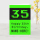 This fun and nerdy birthday-themed greeting card design features a large green retro computer gaming style number "35" on the front. It also features the birthday greeting message "Happy 35th Birthday,", and a name that can be personalized. The inside features a customizable birthday greeting message, or could perhaps be cleared and left blank if a message is to be written by hand instead. A silly birthday greeting card like this might be used to send a birthday greeting message in honor of the thirty fifth birthday of a computer programmer, a computer system administrator, or somebody who APPeciates retro video games. [~Z0000430]