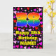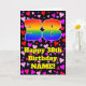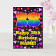 The front of this colorful and joyful birthday themed greeting card design features a large number “38” with a rainbow spectrum gradient inspired pattern, along with the message “Happy 38th Birthday,”, and a custom name. The background of the front features a pattern of pink, red, and purple heart shapes of various sizes. The inside has a custom birthday greeting message, or could perhaps be cleared and left blank if a message is to be written by hand instead. A fun, customized birthday greeting card like this might be used to acknowledge somebody’s thirty-eighth birthday. [~Z0000551]