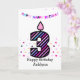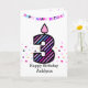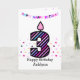 Une carte colorée rose et violet heureux 3ème anniversaire pour elle, que vous pouvez personnaliser avec son nom. Le devant de cette amusante carte de 3ème anniversaire pour elle présente le numéro trois dans une bougie colorée à rayures. L'arrière - plan a des confettis colorés parsemés autour des trois bougies et au-dessus a un joyeux salut d'anniversaire. Le message intérieur peut être facilement personnalisé si vous le souhaitez.