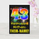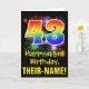 L'avant de cette carte de voeux colorée, excitante et amusante sur le thème de l'anniversaire comprend un grand nombre de "43" ayant un motif inspiré par un gradient de spectre arc-en-ciel. Il comporte également le message "Joyeux 43e anniversaire", et un nom de destinataire modifiable. Le front a en outre un motif arrière - plan coloré inspiré par l'aspect d'un feu d'artifice festif éclatant. L'intérieur comporte un message d'anniversaire personnalisé, ou pourrait être effacé et laissé vide si un message doit être écrit à la main à la place. Une carte d’anniversaire personnalisable comme celle-ci pourrait être une façon amusante d’envoyer un message pour célébrer le quarante-troisième anniversaire de quelqu’un. [~Z0000442]