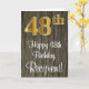Cette carte de vœux de joyeux anniversaire élégante, luxueuse et raffinée présente un grand nombre ordinal « 48ème » avec un aspect doré imité, ainsi que le message « Joyeux 48ème Anniversaire » et un nom personnalisable dans une police de type script sur le devant. Le fond de la face avant présente un motif imitant le bois. L'intérieur comporte un message de vœux d'anniversaire personnalisé, ou pourrait éventuellement être laissé vierge si un message doit être écrit à la main à la place. Une carte de vœux d'anniversaire personnalisée et sophistiquée comme celle-ci pourrait être utilisée pour souhaiter un joyeux anniversaire à quelqu'un qui fête ses quarante-huit ans.