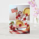 Un cocktail est décoré d'un drapeau américain, de cerises et de tranches de citron sur un tissu à damiers rouge et blanc.