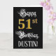 Le devant de cette carte de voeux élégante et élaborée à thème d'anniversaire comporte le message "Happy 51st Birthday", et un nom de destinataire modifiable. Une partie du message est dans un texte formel de style script. Le grand numéro "51st" présente un motif de look imitation or/imitation. L'arrière - plan est noir de couleur. L'intérieur a un message de voeux d'anniversaire personnalisé, ou peut-être peut-être être effacé et laissé vide si un message doit être écrit à la main à la place. Une carte de voeux d'anniversaire customisée comme celle-ci pourrait être un moyen respectable de livrer des voeux d'anniversaire à quelqu'un qui célèbre son cinquante et unième anniversaire. [~Z0000559]