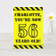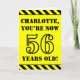 L’avant de cette carte de voeux qui attire l’attention et qui a pour thème l’anniversaire est ornée d’un nom personnalisable et du message "VOUS AVEZ MAINTENANT 56 ANS !" en texte noir inspiré par un pochoir sur un arrière - plan de couleur jaune. L'avant est également orné d'un motif rayé noir et jaune accrocheur aux bords supérieur et inférieur. L'intérieur comporte un message de voeux d'anniversaire personnalisable, ou peut-être pourrait-il être effacé et laissé vide si un message doit être écrit à la main à la place. Une carte d’anniversaire personnalisée comme celle-ci pourrait être une façon amusante d’envoyer un message pour célébrer le cinquantenaire de quelqu’un. [~Z0000413]