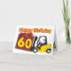 Un chariot élévateur à fourche tient un colis avec l'âge sur lui en lettres jaune vif. Une carte d'anniversaire joyeuse et drôle pour un homme.