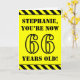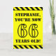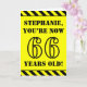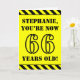 Le recto de cette carte de voeux audacieuse et amusante à thème d’anniversaire comporte un nom personnalisé et le message "VOUS AVEZ MAINTENANT 66 ANS !" en texte noir inspiré par un pochoir sur un arrière - plan de couleur jaune. L'avant est également orné d'un motif rayé jaune et noir accrocheur aux bords supérieur et inférieur. L'intérieur comporte un message de voeux d'anniversaire personnalisé, ou peut-être pourrait-il être effacé et laissé vide si un message doit être écrit à la main à la place. Une carte d’anniversaire personnalisable comme celle-ci pourrait être une façon amusante de souligner le soixante-sixième anniversaire de quelqu’un. [~Z0000413]