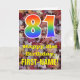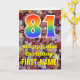 L'avant de cette carte de voeux d'anniversaire colorée, d'inspiration nature et d'automne présente un grand nombre de "81" ayant un motif inspiré par un gradient de spectre arc-en-ciel. Il comporte également le message "Joyeux 81e anniversaire", et un nom modifiable. L'avant est ornée d'un arrière - plan représentant des feuilles d'automne tombées rustiques. L'intérieur comporte un message de voeux d'anniversaire modifiable, ou peut-être pourrait-il être effacé et laissé vide si un message doit être écrit à la main à la place. Une carte d’anniversaire personnalisable comme celle-ci pourrait être une façon amusante d’envoyer un message pour célébrer le quatre-vingt-unième anniversaire de quelqu’un. [~Z0000384]
