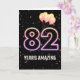 Ballons de fête et confettis sur arrière - plan noir avec le néon numéro 82 pour un 82ème anniversaire.