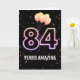 Ballons de fête et confettis sur arrière - plan noir avec le néon numéro 84 pour un 84ème anniversaire.