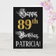 La façade de cette carte de voeux luxueuse et élégante à thème d'anniversaire comporte le message "Happy 89th Birthday", et un nom de destinataire personnalisé. Une partie du message est dans un texte élaboré de style script, le grand numéro "89th" présente un faux/imitation motif d'apparence d'inspiration or, et l'arrière - plan est coloré en noir. L'intérieur a un message de voeux d'anniversaire modifiable, ou peut-être peut-être être effacé et laissé vide si un message doit être écrit à la main à la place. Une carte de voeux d’anniversaire somptueuse et customisée comme celle-ci pourrait être envoyée pour célébrer le quatre-vingt-neuvième anniversaire de quelqu’un. [~Z0000559]