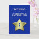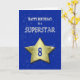Carte de 8ème anniversaire pour une superstar. Une grande étoile dorée portant l'âge flotte dans les cieux. Dans l'arrière - plan, les étoiles scintillent. Une belle carte d'anniversaire pour quelqu'un de très spécial.