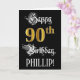 Le devant de cette carte de voeux fantaisie et généreuse à thème d'anniversaire comporte le message "Joyeux 90e anniversaire", et un nom de destinataire modifiable. Une partie du message est dans un texte orné de style script, le grand numéro "90th" dispose d'un faux/imitation motif de look d'inspiration or, et l'arrière - plan est coloré en noir. L'intérieur a un message de voeux d'anniversaire personnalisé, ou peut-être peut-être être effacé et laissé vide si un message doit être écrit à la main à la place. Une carte de voeux d'anniversaire luxueuse et modifiable comme celle-ci pourrait être un moyen respectable d'envoyer des voeux d'anniversaire à quelqu'un qui célèbre son quatre-vingt-dixième anniversaire. [~Z0000559]