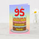 Cette carte de voeux colorée et amusante à thème d'anniversaire présente une représentation de dessin animé d'un gâteau d'anniversaire à trois niveaux avec des bougies en forme de chiffres sur le dessus montrant le numéro "95", avec le message "HAPPY 95TH BIRTHDAY", et un nom de destinataire personnalisé. L'arrière - plan de l'avant dispose d'un motif multicolore pastel en arc-en-ciel inspiré du spectre dégradé. L'intérieur a un message de voeux d'anniversaire personnalisable, ou peut-être peut-être être effacé et laissé vide si un message doit être écrit à la main à la place. Une carte de voeux d’anniversaire joyeuse et customisée comme celle-ci pourrait être envoyée pour célébrer le quatre-vingt-quinzième anniversaire de quelqu’un. [~Z0000625]