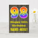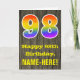 La façade de cette carte de voeux d'anniversaire colorée mais rustique comporte un grand nombre de "98" avec un motif inspiré par un gradient de spectre arc-en-ciel, ainsi que le message "Happy 98th Birthday," et un nom de destinataire modifiable. L'arrière - plan de l'avant de la carte est orné d'un motif d'inspiration rustique en faux bois. L'intérieur comporte un message de voeux d'anniversaire personnalisé, ou peut-être pourrait-il être effacé et laissé vide si un message doit être écrit à la main à la place. Une carte d'anniversaire personnalisée comme celle-ci pourrait être une façon amusante d'envoyer des voeux d'anniversaire à quelqu'un qui célèbre son quatre-vingt-dix-huitième anniversaire. [~Z0000419]