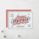 Carte de Noël design vintage avec une typographie de style "Joyeux Noël et Bonne Année". Conçu avec des couleurs rouges et vertes et placé contre un arrière - plan rayé bleu clair en diagonale. Entouré de flocons de neige magnifiquement conçus. Customisez avec votre nom et votre année sur le devant.