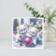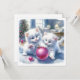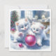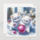 Jolie carte de Noël. Deux petits chatons blancs moelleux jouant avec un ornement de Noël rose brillant.