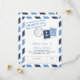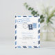 Carte de Save the Date inspirée de l'aérien en bleu marine et bleu poudre. Timbre faux et marques de poste pour un mariage sur le thème du voyage et de la marine.