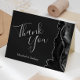 Cette élégante carte de remerciements mariage moderne dispose d'une bordure en aquarelle noire ornée d'une parties scintillant en faux argent. Le texte gris argenté personnalisable combine les mots "Merci" en écriture manuscrite et les noms de la mariée et du marié en caractères italiques sur un arrière - plan noir d'ardoise.