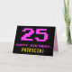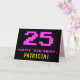 Le devant de cette carte de voeux amusante, nerveuse et geeky à thème d'anniversaire comporte un grand numéro "25" et le message "HAPPY BANTHDAY", couleur rose, avec un nom de destinataire personnalisé jaune gras. Le texte a un look inspiré de celui de la vidéo 8 bits classique de style vidéo/jeu informatique des années 1970 et 1980, et l'arrière - plan est en noir coloré. L'intérieur comporte un message de voeux d'anniversaire personnalisable, ou peut-être pourrait-il être effacé et laissé vide si un message doit être écrit à la main à la place. Une carte d’anniversaire personnalisée comme celle-ci pourrait être une façon amusante de reconnaître le vingt-cinquième anniversaire de quelqu’un. [~Z0000478]