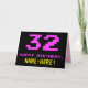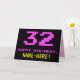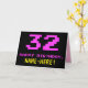 Le devant de cette carte de voeux d'anniversaire amusant, geek et nerdy comporte un grand numéro "32" et le message "HAPPY BANTHDAY", rose coloré, avec un nom de destinataire personnalisé jaune gras. Le texte présente un look inspiré de celui de la vidéo 8 bits rétro style vidéo/jeu informatique des années 1970 et 1980, et l'arrière - plan est noir de couleur. L'intérieur comporte un message de voeux d'anniversaire personnalisé, ou peut-être pourrait-il être effacé et laissé vide si un message doit être écrit à la main à la place. Une carte d’anniversaire personnalisée comme celle-ci pourrait être une façon amusante de reconnaître le trente-deuxième anniversaire de quelqu’un. [~Z0000478]