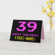 Le devant de cette carte de voeux d'anniversaire amusant, nerdy et geeky comporte un grand numéro "39" et le message "HAPPY BANTHDAY", couleur rose, avec un nom de destinataire jaune gras personnalisé. Le texte présente un look inspiré de celui de jeu vidéo et de jeu vidéo de style 8 bits vintage des années 1970 et 1980, et l'arrière - plan est noir de couleur. L'intérieur a un message de voeux d'anniversaire customisé, ou peut-être peut-être être effacé et laissé vide si un message doit être écrit à la main à la place. Une carte d’anniversaire personnalisable comme celle-ci pourrait être une façon amusante de reconnaître le trente-neuvième anniversaire de quelqu’un. [~Z0000478]