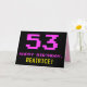Le devant de cette carte de voeux d'anniversaire amusant, nerdy et geeky comporte un grand numéro rose "53", ainsi que le message "HAPPY BANTHDAY," en rose, et un nom de destinataire personnalisé jaune gras. Le texte présente un aspect inspiré de celui des graphiques vidéo/jeux vidéo 8 bits vintages des années 1970 et 1980, et l'arrière - plan est en noir coloré. L'intérieur comporte un message de voeux d'anniversaire personnalisé, ou peut-être pourrait-il être effacé et laissé vide si un message doit être écrit à la main à la place. Une carte d'anniversaire ridicule comme celle-ci pourrait être une façon amusante d'envoyer des voeux d'anniversaire à une femme ou à quelqu'un d'autre qui célèbre son cinquante-troisième anniversaire. [~Z0000478]