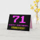 Le recto de cette carte de voeux amusante, nerveuse et geeky d'anniversaire avec un grand numéro rose "71", avec le message "HAPPY BANTHDAY," en rose, et un nom de destinataire personnalisable jaune gras. Le texte a un aspect inspiré de celui de 8-bit de style rétro ordinateur/jeux vidéo graphiques des années 1970 et 1980, et l'arrière - plan est coloré noir. L'intérieur a un message d'anniversaire personnalisé, ou peut-être peut-être être effacé et laissé vide si un message doit être écrit à la main à la place. Une carte d'anniversaire ridicule comme celle-ci pourrait être une façon amusante d'envoyer des voeux d'anniversaire à une femme ou à quelqu'un d'autre qui célèbre son soixante-et-onze anniversaire. [~Z0000478]
