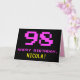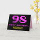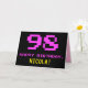 La façade de cette carte de voeux amusante, geek et nerdy à thème d'anniversaire comporte un grand numéro "98" et le message "HAPPY BANTHDAY", couleur rose, avec un nom de destinataire jaune gras personnalisé. Le texte a un look inspiré de celui de jeu vidéo 8 bits classique et de graphismes de jeux informatiques des années 1970 et 1980, et l'arrière - plan est noir de couleur. L'intérieur a un message de voeux d'anniversaire customisé, ou peut-être peut-être être effacé et laissé vide si un message doit être écrit à la main à la place. Une carte d’anniversaire personnalisée comme celle-ci pourrait être une façon amusante de célébrer le quatre-vingt-dix-huitième anniversaire de quelqu’un. [~Z0000478]