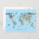 Une carte du monde avec des animaux de dessins animés, des monuments célèbres et des bâtiments. Une carte colorée, amusante et passionnante pour n'importe quel jeune enfant afin d'attirer son imagination. Arrière - plan bleu clair.