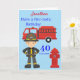 Conception amusante d'un sapeur-pompier avec le camion de pompiers et la borne d'incendie. Cette carte serait une carte amusante à envoyer à tout adulte qui a un anniversaire. L'âge et l'âge sur le casque peuvent être modifiés à un âge différent, le nom en haut de la carte et le message à l'intérieur, qui se lit « Joyeux Anniversaire ..... passez un temps pyromane.... amour de .... » peuvent être modifiés pour personnaliser la carte.
