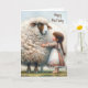 Une petite fille en robe à motifs admire un grand mouton avec une énorme toison moelleuse pour l'anniversaire. Le texte est modifiable.