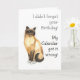Une carte d'anniversaire "tardive" avec un chat Birman affirmant que c'est la faute du Calendrier qu'il a oublié votre anniversaire, d'une aquarelle de Judy Adamson. Le message intérieur est "Joyeux anniversaire (tardif) !"