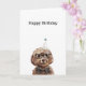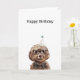 Bonne carte d'anniversaire de votre Cockapo Brown. Cockapo Brown avec cravate arc, verre et casquette de fête.