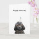 Bonne carte d'anniversaire de votre Cockapou Noir. Cockapo noir avec cravate arc, verre et casquette de fête.