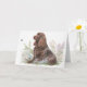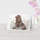 Aquarelle design d'un mignon chien d'espagne cocker chocolat dans un jardin fleuri pour l'anniversaire de n'importe qui.